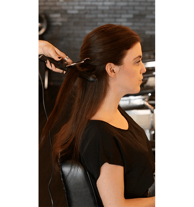 Hold your hair at the end and wrap it around the bottom plate of the flat iron starting at about the middle of the hair shaft. Once you have your hair tightly wrapped, spin the iron toward your head—this will wrap the rest of the hair around the entire iron. The iron is basically creating a curl by moving the hair around the hot plates in a wrapping motion instead of being pulled straight.